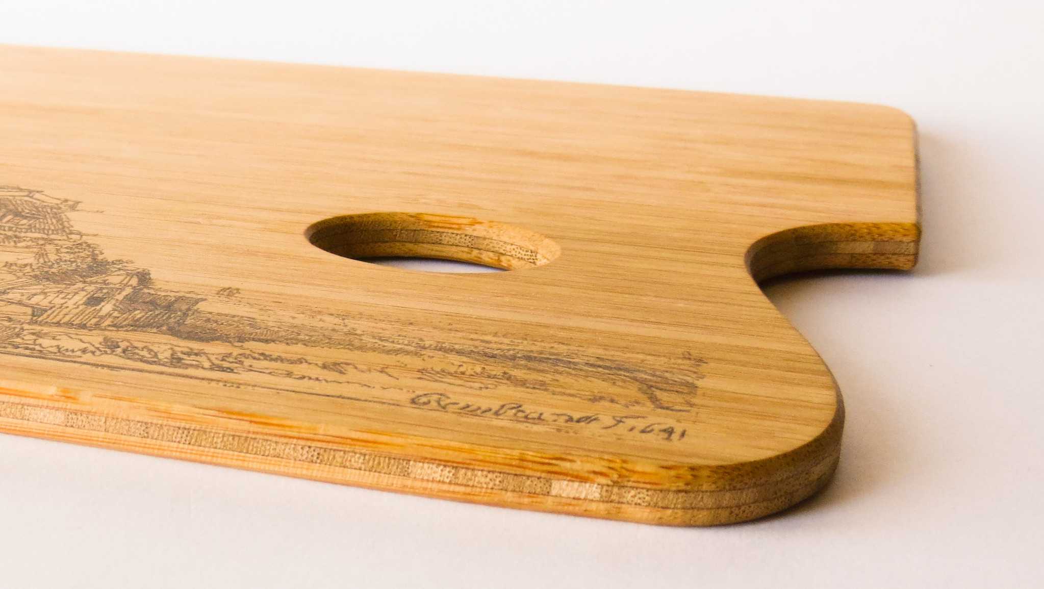 Serving Tray made of 100% bamboo with print of B233 The Windmill by Rembrandt. Nuances in colour are possible due to the nature of bamboo. To protect the image: use as serving plate only and wash by hand. 28 x 19 cm, thickness 8 mm, the shape is a palette.
