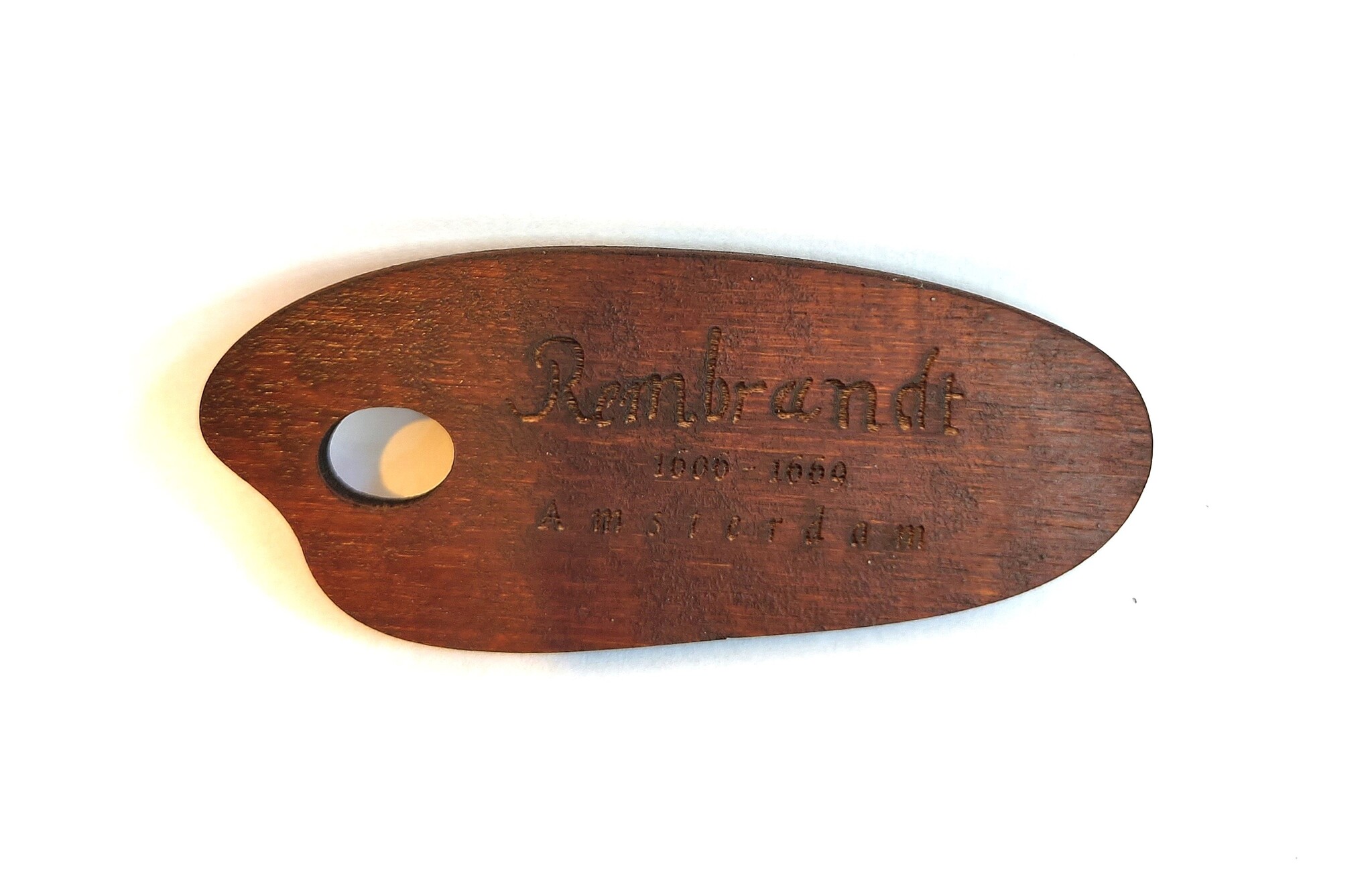 Houten magneet in de vorm van het palet van Rembrandt. Ingebrande inscriptie Rembrandt 1606 - 1669 Amsterdam. Bij de rode is de inscriptie zwart ingekleurd, bij de blauwe met goudkleur. Maat magneet is 10 x 4 cm.